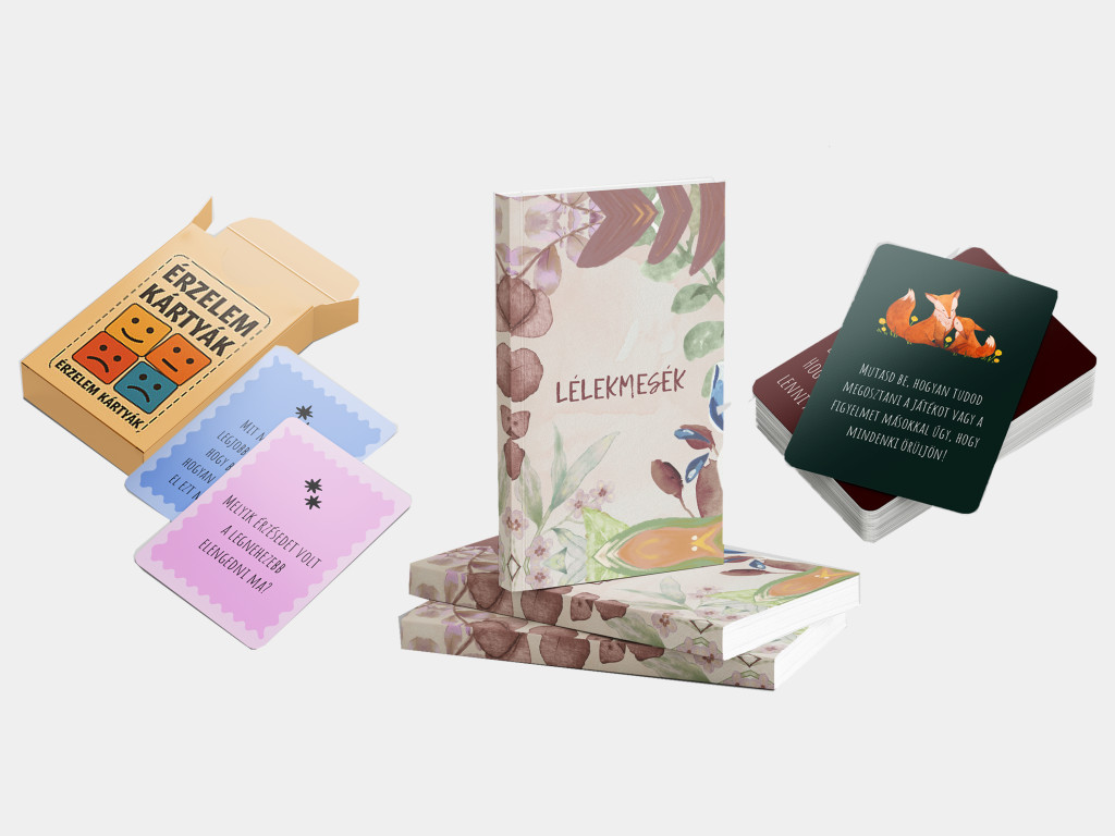 Egyéni terápiában: a mini könyv és a kártyák segítségével könnyen lehet érzelmi témákat feldolgozni, reflektáló kérdésekkel és kreatív feladatokkal.